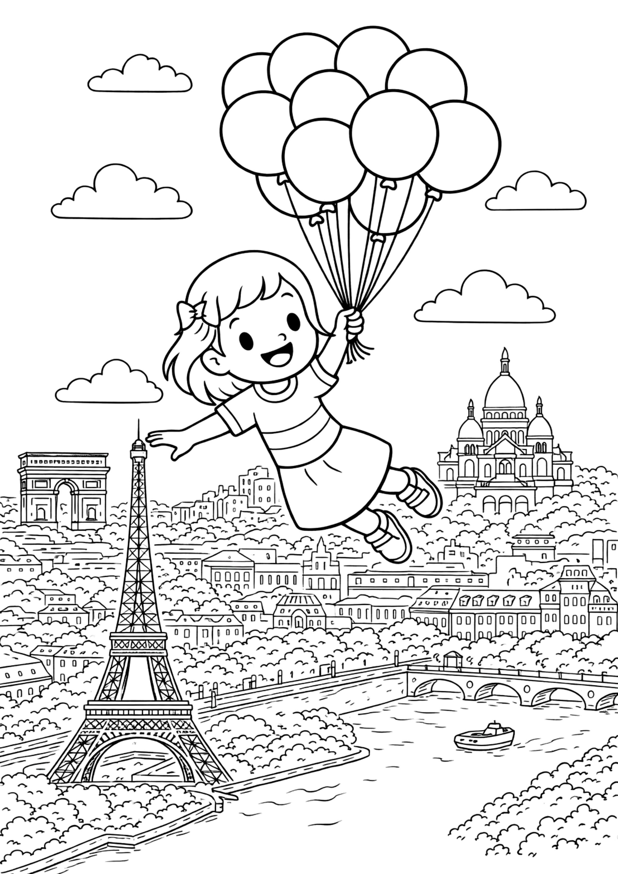 Fille survolant Paris avec ballons